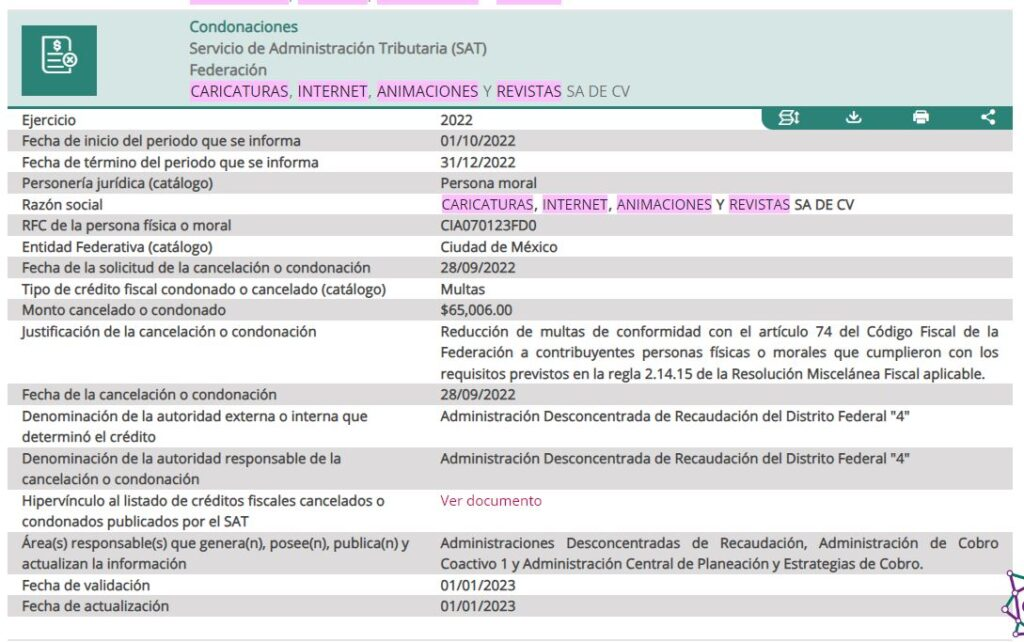 El 28 de septiembre de 2022, el Servicio de Administración Tributaria (SAT) perdonó multas a la empresa Caricaturas, Internet, Animaciones y Revistas, que edita la revista El Chamuco y los hijos del Averno, por 65 mil pesos mexicanos. Así lo pudo corroborar el equipo de etcétera a través de la Plataforma Nacional de Transparencia.