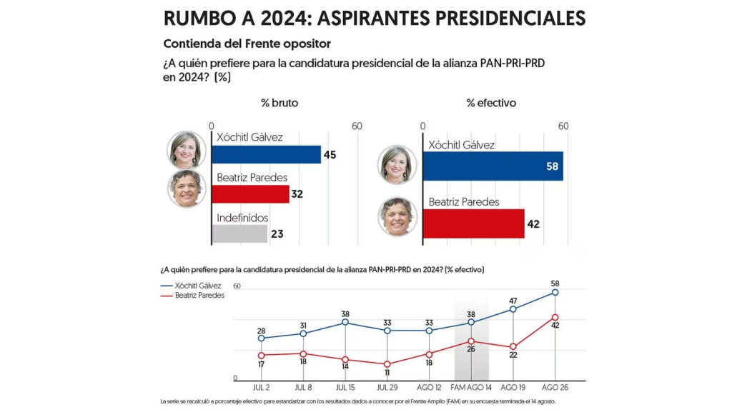 En el caso de Xóchitl Gálvez, cerró con 58% de las preferencias al interior del Frente Amplio por México, 16 puntos por delante de Beatriz Paredes.