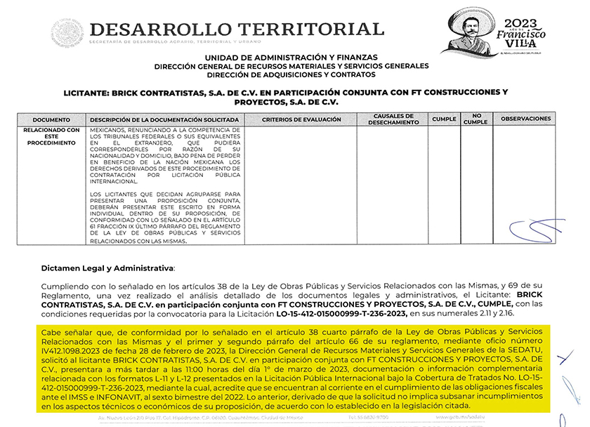 La convocatoria establecía que el resultado de la licitación se haría el 28 de febrero a las 5 de la tarde, pero ese mismo día se aplazó el fallo debido a que se dio oportunidad a que el licitante “Brick Contratistas” en participación conjunta con “FT Construcciones y Proyectos” completara su expediente, ya que no había acreditado estar al corriente en el cumplimiento de sus obligaciones ante el IMSS e Infonavit.