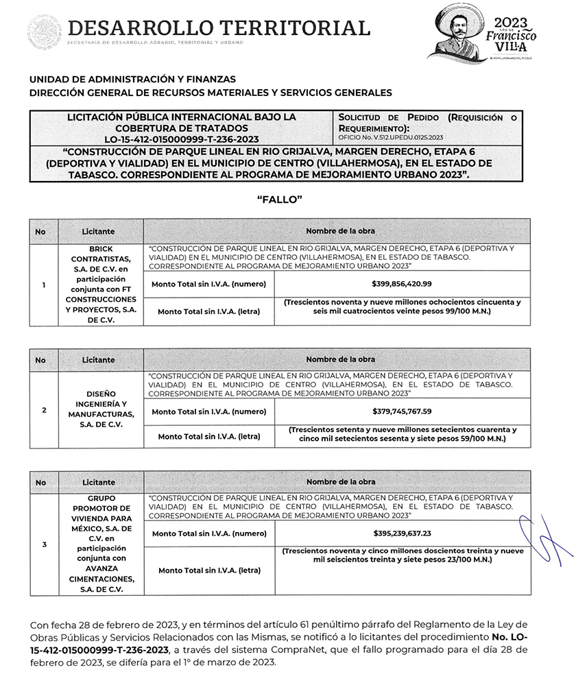 El jueves 16 de febrero de 2023, la Sedatu publicó en la plataforma de Compranet la convocatoria para la licitación de la obra denominada “Construcción de parque lineal en Río Grijalva, margen derecho, etapa 6”, en la cual se dio a las empresas interesadas un plazo de 7 días hábiles para presentar las propuestas, pues la recepción cerró el lunes 27 de febrero a las 11 horas.