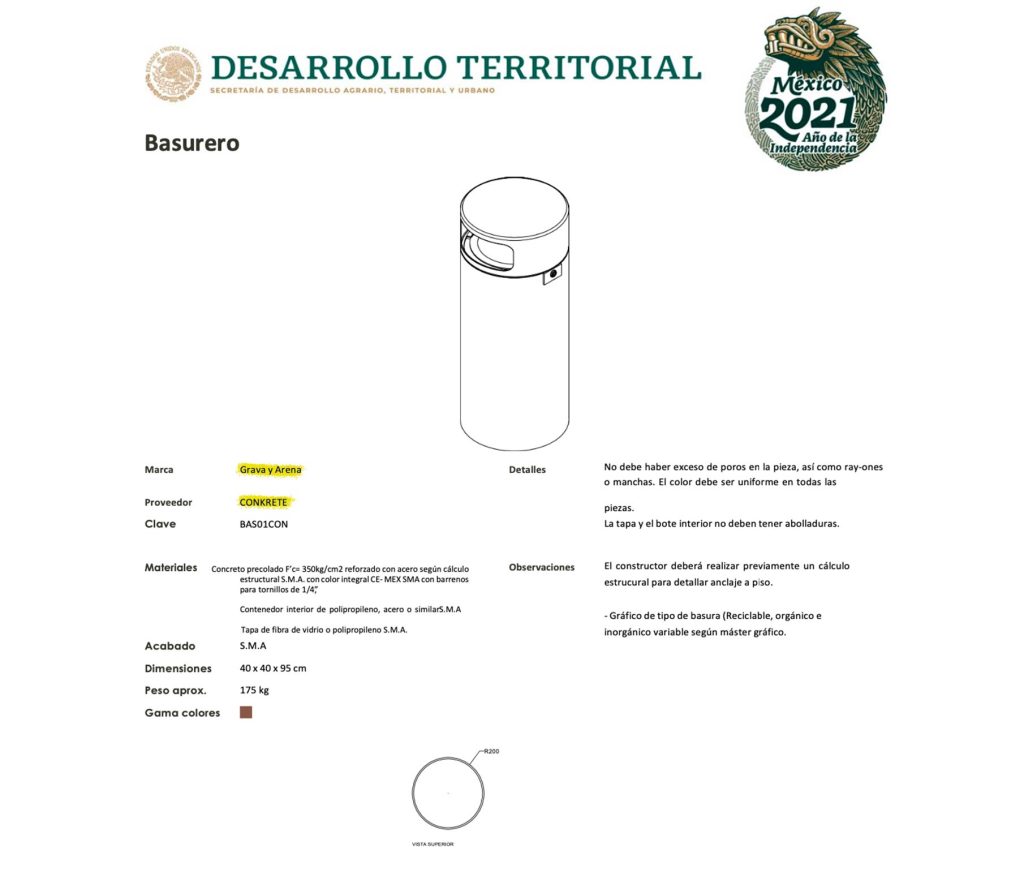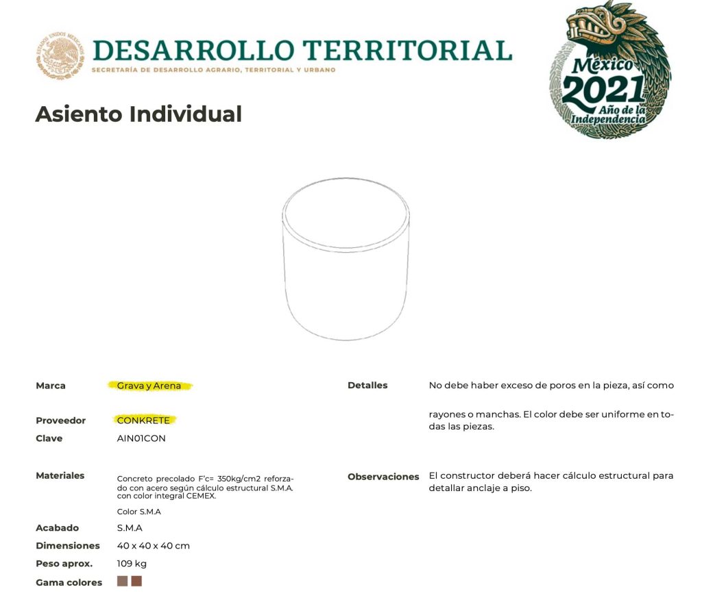 En fichas técnicas de distintas obras, la Sedatu instruyó a los contratistas a colocar muebles urbanos de “Grava y Arena” y anotó como el proveedor de los mismos a “Conkrete”. Así ocurrió, por ejemplo, en obras en Campeche y en la remodelación del estadio de Villahermosa.