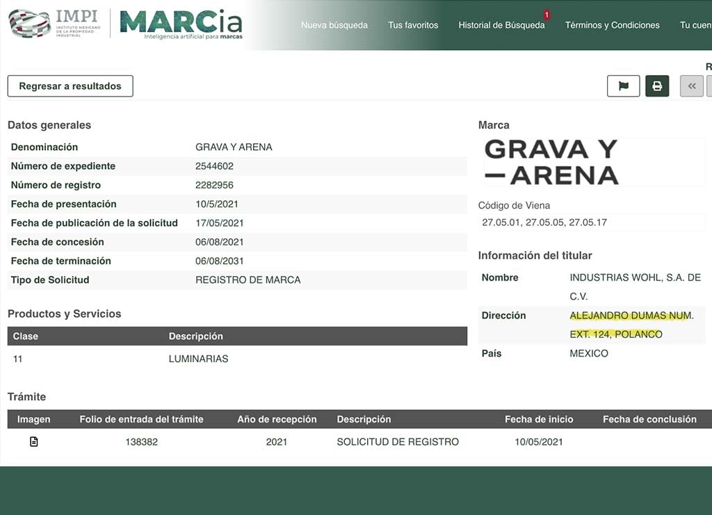 Al registrar la marca “Grava y Arena”, Buentello aportó como su domicilio una casa en Polanco que corresponde a la empresa Pirwi, propiedad de Alejandro Castro Jiménez Labora, amigo de Andy y a quien López Obrador le encomendó supervisar la obra del Malecón.