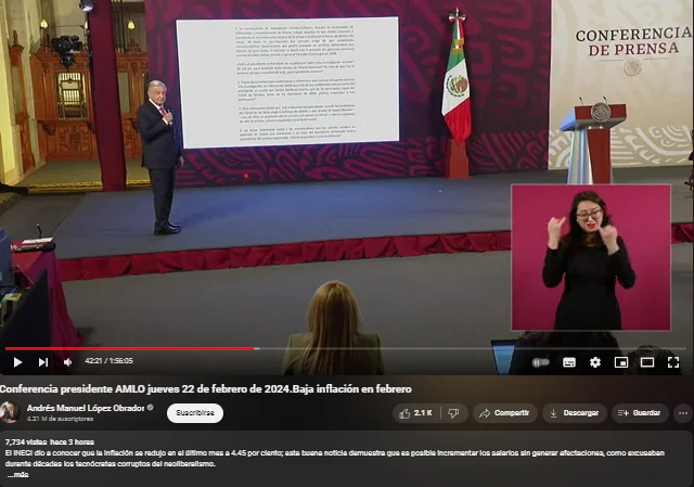Este sábado la más popular plataforma de videos de internet retiró la conferencia de prensa presidencial del jueves 22 de febrero. Este día ya sólo apareció en la pantalla correspondiente la leyenda “Este video se quitó debido a que infringe las Condiciones del Servicio de YouTube”. Sobre esto se afirma que fue debido a que se cometió hostigamiento y acoso.