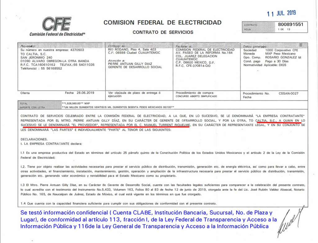 El tuitero Oscar (@ALEPHBIO) exhibió un contrato que la CFE otorgó en julio de 2019 a la empresa To Caltia, de la que es socio fundador Manuel Turrent Riquelme, progenitor de Renata Turrent, quien en su cuenta de X presume el cargo de coordinadora de Enlace con Diálogos por la Transformación de la campaña presidencial de Sheinbaum.
