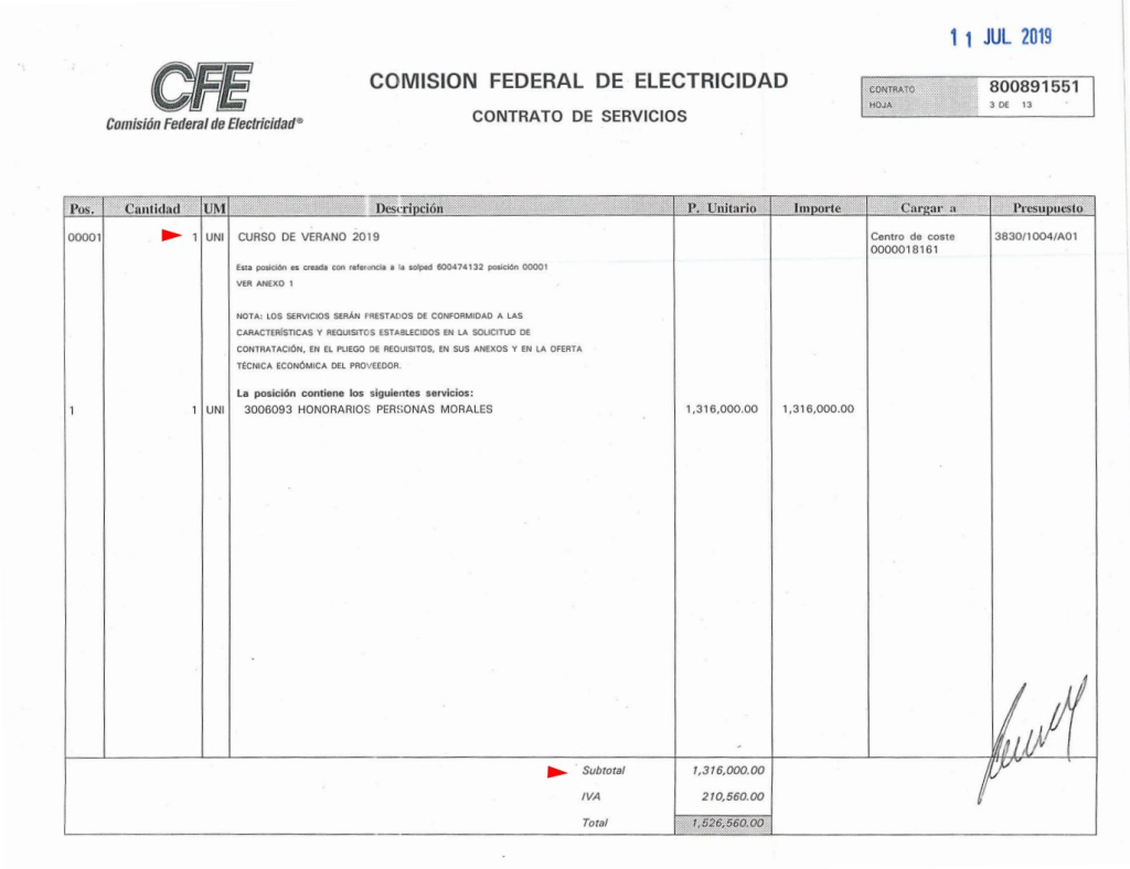 En los documentos mostrados se muestra que el contrato fue por “curso de verano 2019”, el que To Caltia, sociedad firmada en 2004, obtuvo por concurso abierto simplificado, por un monto de un millón 316 mil pesos. Como representante legal de esta empresa aparece Turrent Riquelme.