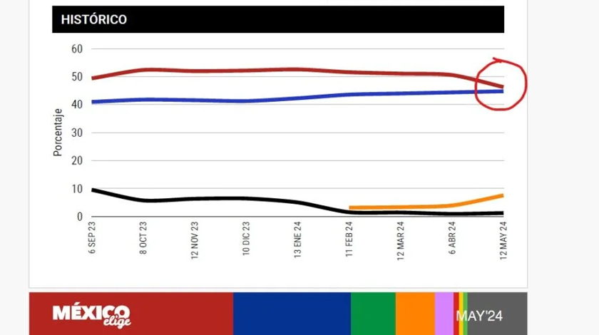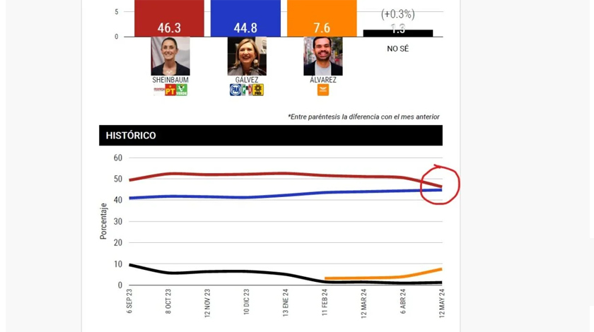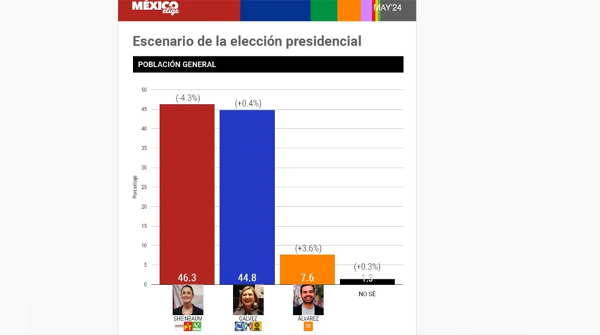 La encuesta de mayo de México Elige reveló que en el último mes la distancia entre Claudia Sheinbaum y Xóchitl Gálvez se acortó de tal modo que ya se encuentran en un empate estadístico, puesto que la morenista ya sólo la supera por 1.5 puntos, debido a que de abril mayo cayó 4.3% mientras que Xóchitl creció 0.4%.