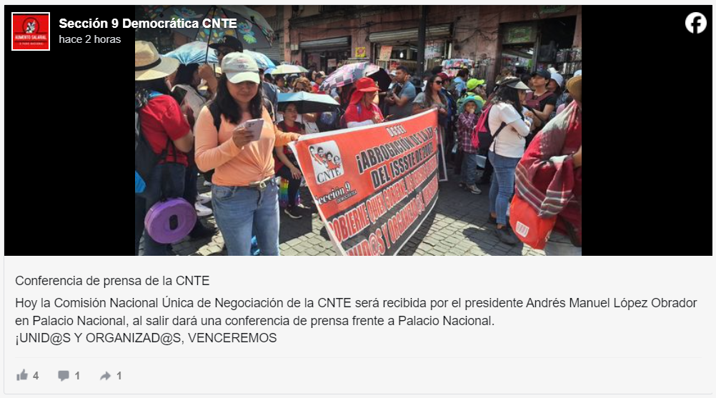 Por otra parte, la comisión encargada de la negociación indicó que ofrecerá una conferencia de prensa después de que salgan de Palacio Nacional, según una publicación de la Sección 9 en su cuenta de Facebook.