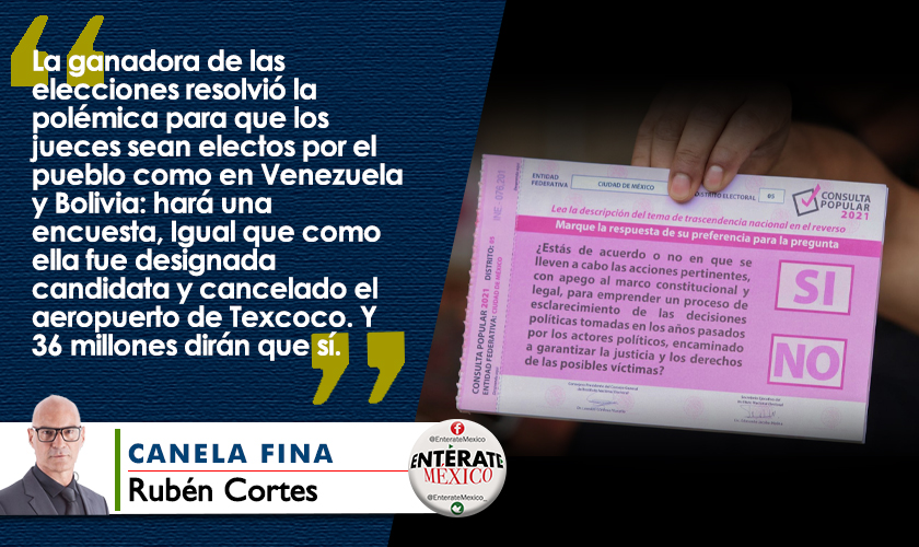 Ayer la ganadora de las elecciones resolvió la polémica para que los jueces sean electos por el pueblo como en Venezuela y Bolivia: hará una encuesta. Igual que como ella fue designada candidata, y como fue cancelado el aeropuerto de Texcoco.