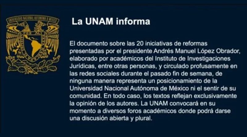 “El documento sobre las 20 iniciativas de reformas presentadas por el presidente Andrés Manuel López Obrador, elaborado por académicos del Instituto de Investigaciones Jurídicas, entre otras personas, y circulado profusamente en las redes sociales durante el pasado fin de semana, de ninguna manera representa un posicionamiento de la Universidad Nacional Autónoma de México ni el sentir de su comunidad.