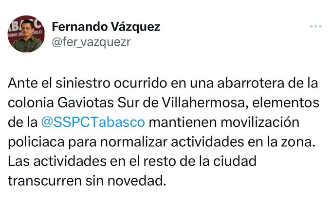 «Ante el siniestro ocurrido en una abarrotera de la Colonia Gaviotas Sur de Villahermosa, elementos de la SSPCTabasco mantienen movilización policiaca para normalizar actividades en la zona», indicó en redes sociales el coordinador general de Comunicación Social y Vocero del Gobierno de Tabasco, Fernando Vázquez.