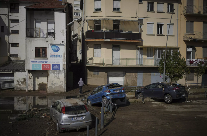 Un hombre camina junto a unos coches en Rive-de-Gier, en el centro de Francia, después de que las lluvias torrenciales y las inundaciones sumergieran carreteras y vías férreas, el viernes 18 de octubre de 2024. © Laurent Cipriani – AP