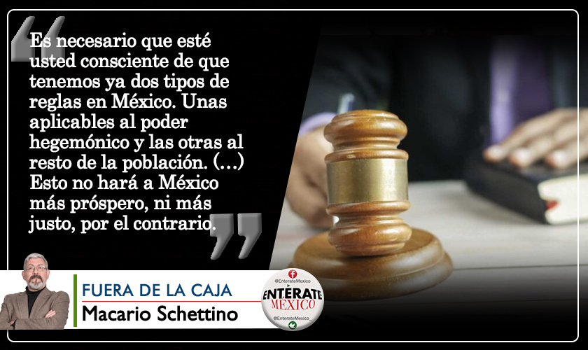 Es necesario que esté usted consciente de que tenemos ya dos tipos de reglas en México. Unas aplicables al poder hegemónico y las otras al resto de la población. Dos varas de medir, o ley del embudo, como usted prefiera. Esto no hará a México más próspero, ni más justo; por el contrario. Las posibilidades de revertirlo no son muy grandes. No parece existir una masa crítica con una idea clara de oposición; las estructuras políticas están en demolición, o apenas en los cimientos; el momentum global también juega en contra.