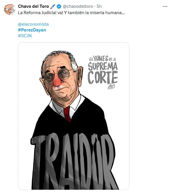En redes sociales y en manifestaciones públicas, el ministro Dayán es calificado como un traidor. Ayer, tras el desistimiento del Pleno para analizar el tema debido al anunciado voto en contra de Pérez Dayán (que nunca se llegó a emitir, puesto que jamás se hizo la votación), manifestantes a las afueras de la SCJN rayonearon una manta con los rostros de los ministros escribiendo “traidor” sobre el semblante de Pérez Dayán.