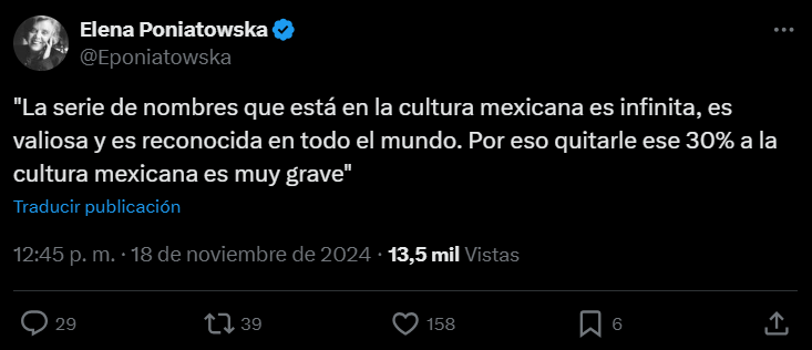 “Ha decidido el gobierno bajarle un 30% a la cultura mexicana, a la cultura de México, lo cual es muy grave porque finalmente lo que nosotros le damos a México ha sido nuestra cultura, nuestros grandes escritores, reconocidos en el mundo entero”, dijo en Feria Internacional del Libro de Coyoacán.