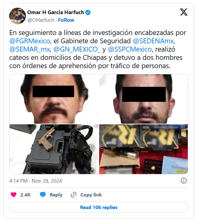 Por su parte, a través del comunicado difundido a través de sus redes sociales, el secretario de Seguridad y Protección Ciudadana de México, Omar García Harfuch, sólo informó que tras un operativo conjunto de fuerzas federales, se logró la detención de dos sujetos acusados de traficar personas en Chiapas.
