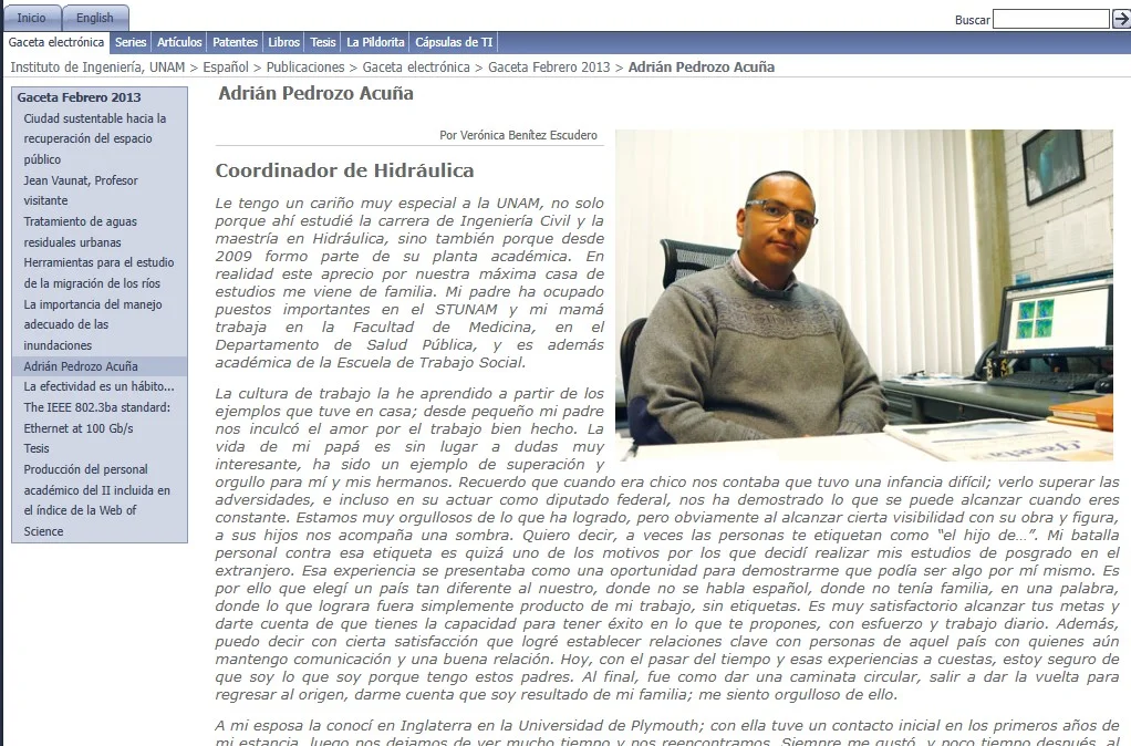 En el sitio oficial del gobierno de México se dice de Adrián Pedrozo lo siguiente, en una nota que informó de su nombramiento: “Con una sólida trayectoria y reconocimiento nacional e internacional, el Dr. Pedrozo ha dirigido y ejecutado diversas líneas de investigación, como son el riesgo ante eventos hidrometeorológicos extremos y el desarrollo sostenible, entre otros. Anteriormente se desempeñó como Coordinador de Hidráulica del Instituto de Ingeniería de la Universidad Nacional Autónoma de México”.