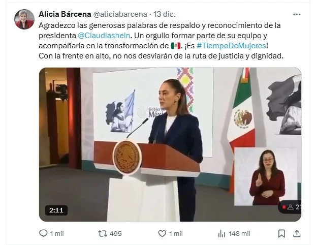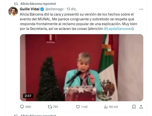 Agregó que “al no retuitearlo, al otro día le llamó un achichincle de Alicia Bárcena para pedirle su renuncia para el 10 de enero con efectos al 15 de enero”.