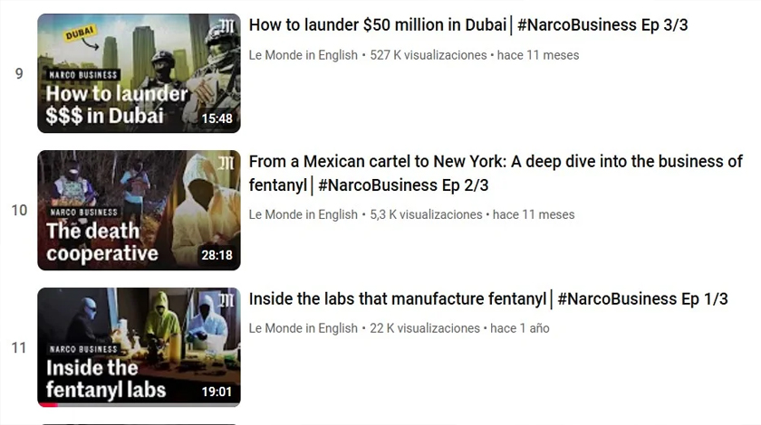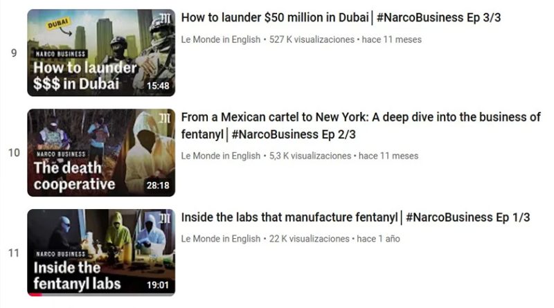 Dice la descripción del video: “Durante dos años, Bertrand Monnet se sumergió profundamente en el corazón del cartel más poderoso: el Cartel de Sinaloa. Cámara en mano, el profesor de negocios y especialista en economía criminal documentó, por primera vez, cada etapa de este modelo de narconegocio, desde la manufactura del fentanilo en cocheras en Culiacán, hasta el lavado de dinero sucio en los rascacielos de Dubai. Las grabaciones y entrevistas de Monnet, realizadas para Le Monde, brindan una mayor comprensión de cómo operan estos ultraeficientes y violentos criminales internacionales. Descubrió también que apuntan a un nuevo mercado: Francia. En este primer episodio, te llevamos a lo profundo de los laboratorios clandestinos de Culiacán, la fortaleza del Cartel de Sinaloa en el noroeste de México. Aquí es donde los cocineros, como les dicen los narcos, manufacturan píldoras M30, al mezclar fentanilo con heroína. Es una técnica tan simple como peligrosa (y totalmente ilegal) que deja ganancias extraordinarias. https://www.youtube.com/watch?v=02lo3XdYcnA&t=33s