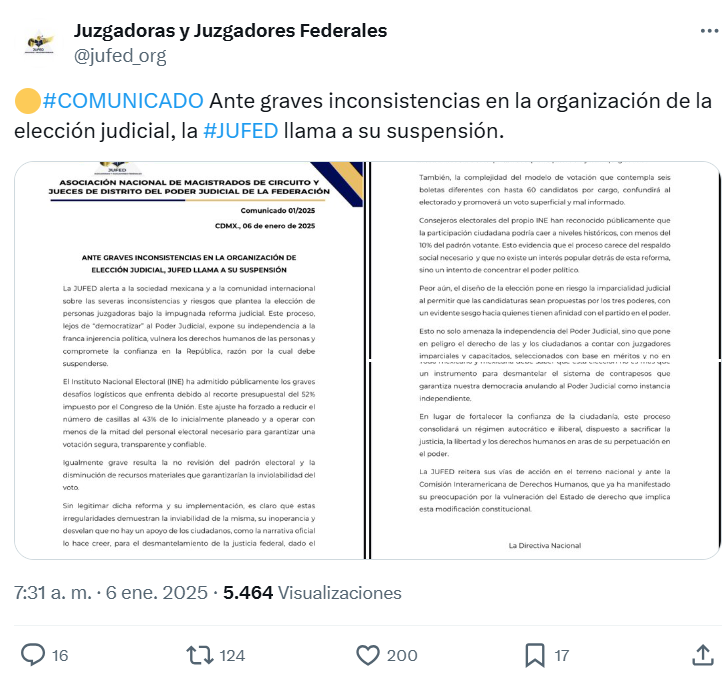 Por último, la Jufed condena que las suspensiones judiciales otorgadas contra la reforma al Poder Judicial han sido desestimadas o ignoradas, lo que constituye un incumplimiento flagrante del orden jurídico.