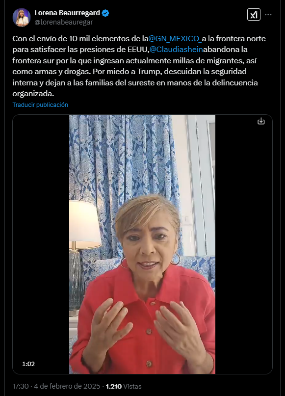 Por su parte, la ex candidata a gobernadora de Tabasco, Lorena Beaurtegard, reclamó que se deje sin seguridad a los estados del sureste y a la Frontera Sur, para acatar las instrucciones de Trump.