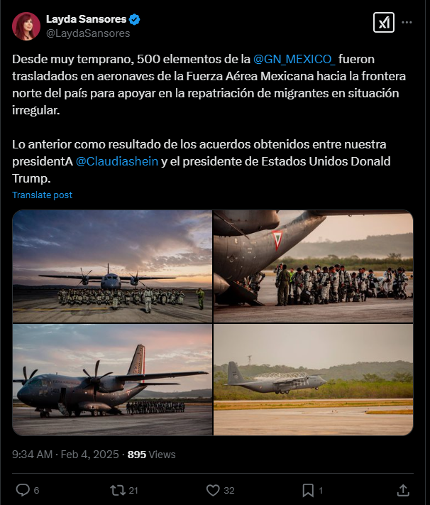 “Desde muy temprano, 500 elementos de la @GN_MEXICO_ fueron trasladados en aeronaves de la Fuerza Aérea Mexicana hacia la frontera norte del país para apoyar en la repatriación de migrantes en situación irregular”, escribió la mandataria en sus redes sociales.