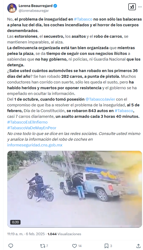 Citando datos oficiales, añadió que entre el 1 de octubre, cuando tomó posesión el morenista Javier May y el 5 de febrero, se robaron 843 autos en #Tabasco, casi 7 carros diariamente, un asalto armado cada 3 horas 40 minutos.