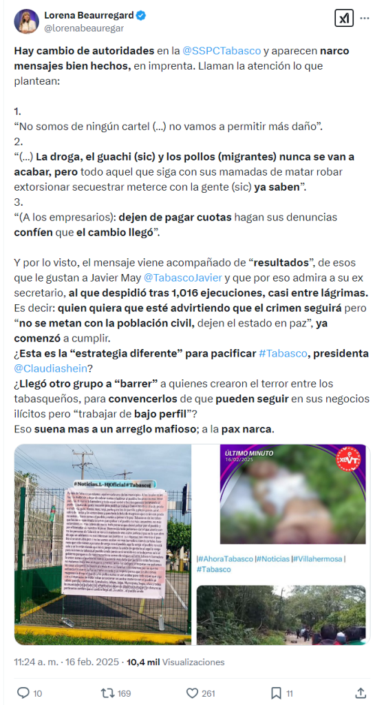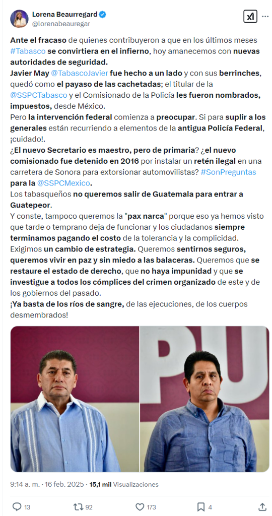 También plantea Beaurregard de los Santos que los tabasqueños “no queremos salir de Guatemala para entrar a Guatepeor. Y conste, tampoco queremos la «pax narca» porque eso ya hemos visto que tarde o temprano deja de funcionar y los ciudadanos siempre terminamos pagando el costo de la tolerancia y la complicidad”.