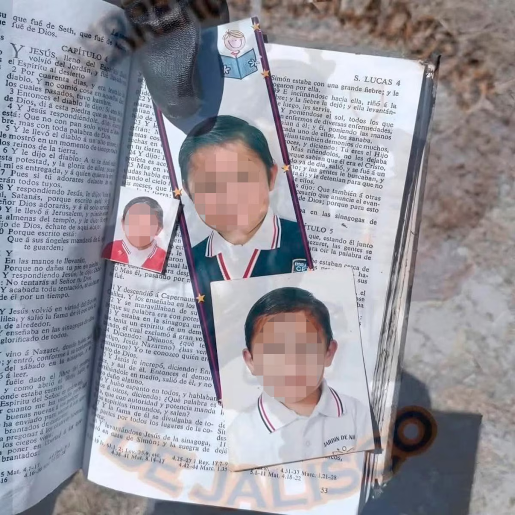 “Estás fotos encontradas en el rancho de Teuchitlán pueden ser esperanza para alguna familia. Papá o mamá las cargaba, fueron encontradas en medio de una biblia, una foto que nos conmueve y nos llena de mucha tristeza el pensar que probablemente esa persona lo último que vio fue la foto de su hijo, que se encomendaba a dios pidiendo por su vida para poder regresar a ver y abrazar a este pequeñito”, compartió el colectivo.