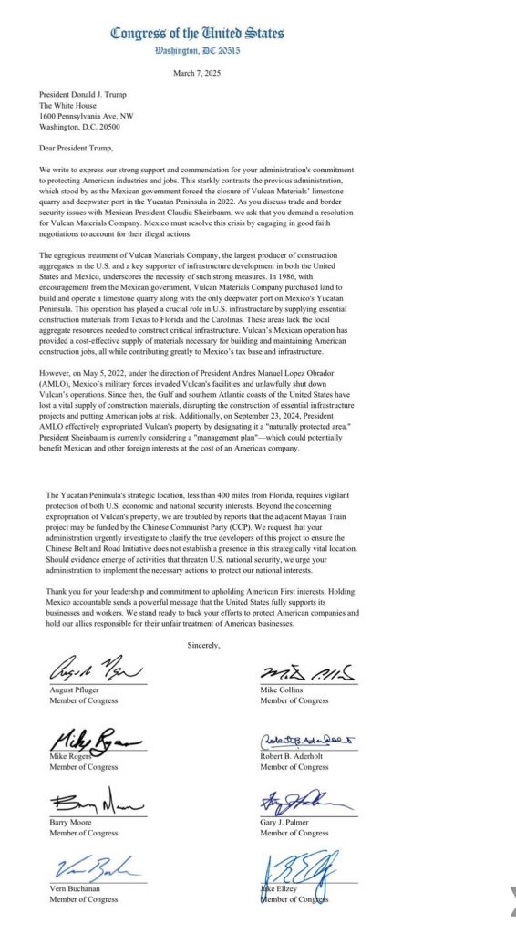 Le escribimos para expresar nuestro fuerte apoyo y reconocimiento por el compromiso de su administración con la protección de las industrias y empleos estadounidenses. Este compromiso contrasta claramente con las acciones previas adoptadas por el gobierno mexicano, que ordenó el cierre de la cantera y terminal de exportación de Vulcan Materials en la Península de Yucatán en 2022. A medida que usted discute comercio y seguridad fronteriza con la presidenta mexicana Claudia Sheinbaum, le instamos a que exija una resolución a la crisis de Vulcan Materials Company. México debe resolver esta crisis mediante negociaciones de buena fe para permitir que esta empresa estadounidense continúe con sus operaciones legítimas.