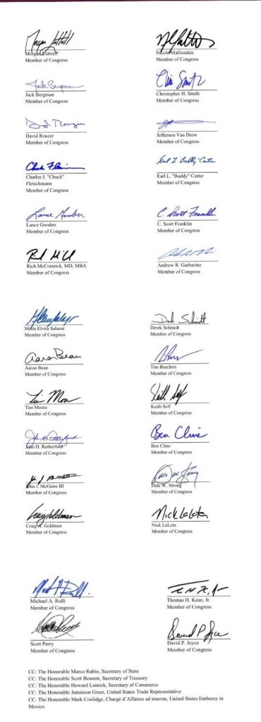 Treinta y seis congresistas norteamericanos le pidieron al presidente Donald Trump que no sólo presione a México por el tema de las drogas y la migración, sino también por medidas estatistas y en contra del libre comercio tomadas por la 4T.