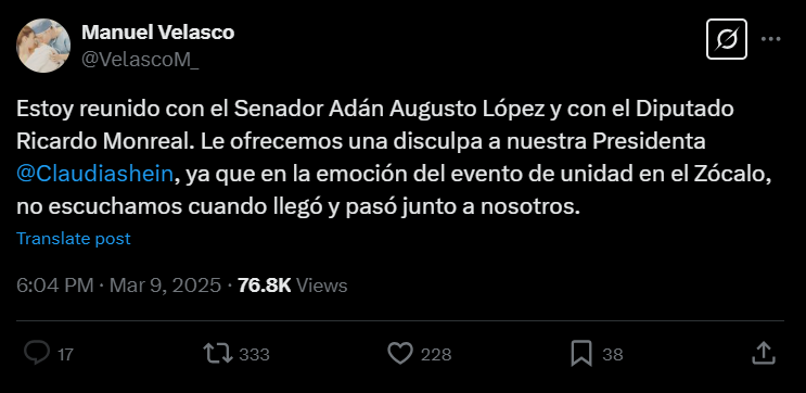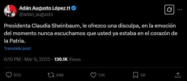 “Le ofrecemos una disculpa a nuestra presidenta Claudia Sheinbaum, ya que en la emoción del evento de unidad en el Zócalo, no escuchamos cuando llegó y pasó junto a nosotros”, escribió desde su cuenta de X.