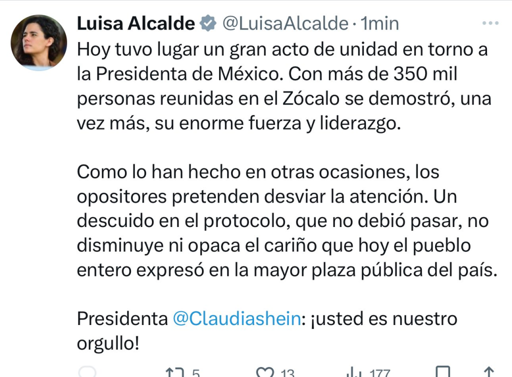 “Un descuido en el protocolo, que no debió pasar, no disminuye ni opaca el cariño que hoy el pueblo entero expresó en la mayor plaza pública del país”, añadió.