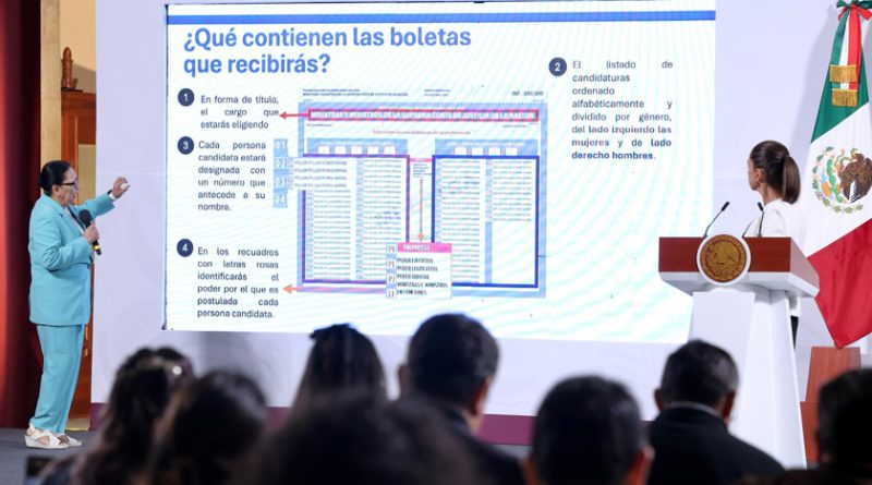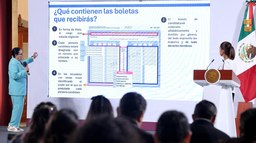 El gobierno de la presidenta Claudia Sheinbaum promocionó este miércoles la elección judicial durante la conferencia matutina en Palacio Nacional.