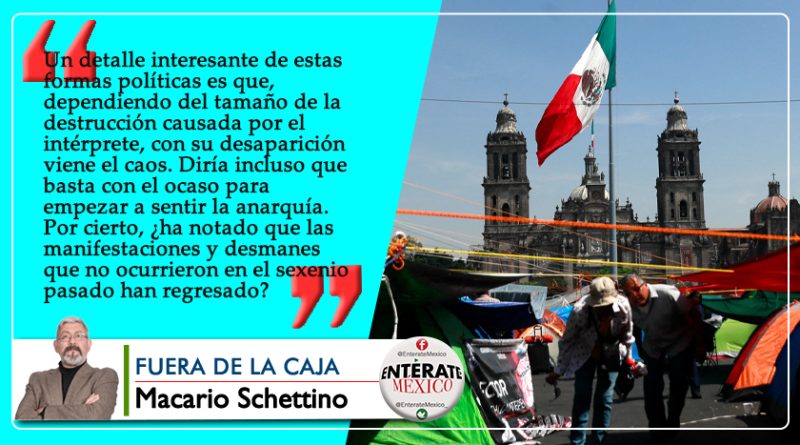 Un detalle interesante de estas formas políticas es que, dependiendo del tamaño de la destrucción causada por el intérprete, con su desaparición viene el caos. Diría incluso que basta con el ocaso para empezar a sentir la anarquía. Por cierto, ¿ha notado que las manifestaciones y desmanes que no ocurrieron en el sexenio pasado han regresado?