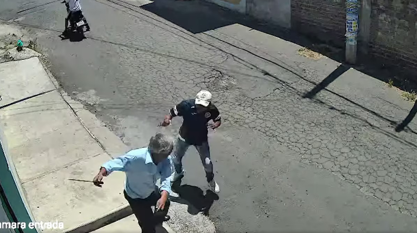 De acuerdo con el video, un sujeto esperaba a su cómplice en la banqueta a bordo de una motocicleta, de repente un hombre salió despavorido y detrás de él, un adulto mayor amenazaba con un machete. Todo quedó captado en una cámara de seguridad particular.