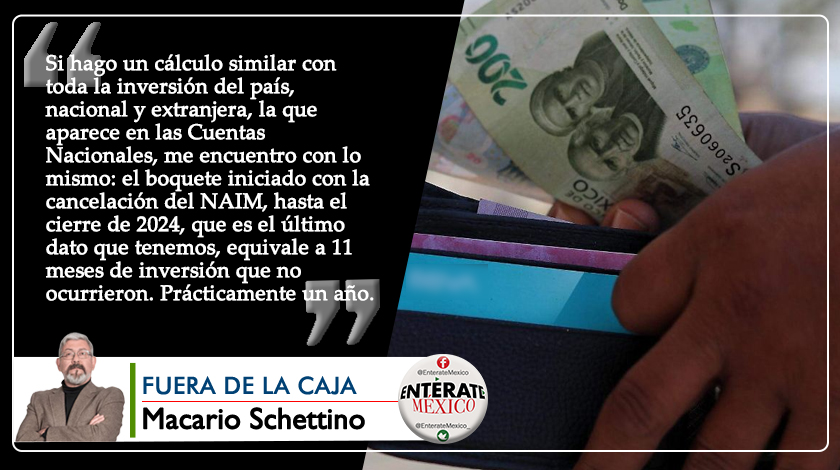 Si hago un cálculo similar con toda la inversión del país, nacional y extranjera, la que aparece en las Cuentas Nacionales, me encuentro con lo mismo: el boquete iniciado con la cancelación del NAIM, hasta el cierre de 2024, que es el último dato que tenemos, equivale a 11 meses de inversión que no ocurrieron. Prácticamente un año.