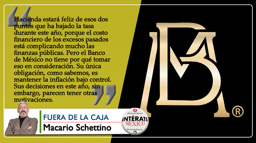 Sin duda, Hacienda estará feliz de esos dos puntos que ha bajado la tasa durante este año, porque el costo financiero de los excesos pasados está complicando mucho las finanzas públicas. Pero el Banco de México no tiene por qué tomar eso en consideración. Su única obligación, como sabemos, es mantener la inflación bajo control. Sus decisiones en este año, sin embargo, parecen tener otras motivaciones.