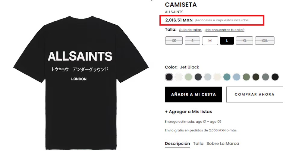 El joven viste una camiseta negra con la leyenda “All Saints”, modelo que fue localizado por usuarios de redes. Se difundió en diversas cuentas que el precio en la tienda en línea “Revolve Man” es de 2 mil 16 pesos, aunque en otros portales y tiendas puede salir más cara.