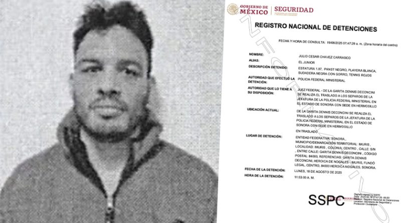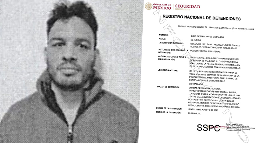 De acuerdo con el Registro Nacional de Detenciones, Julio César Chávez Jr. fue ingresado a un penal de Hermosillo, Sonora, el lunes 18 de agosto de 2025, a las 11:53 de la mañana. Vestía un pantalón deportivo, sudadera negra, camiseta blanca y tenis rojos, según detalla el documento oficial.