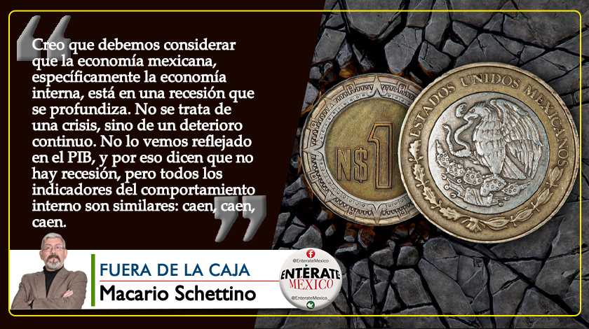 Por lo anterior, creo que debemos considerar que la economía mexicana, específicamente la economía interna, está en una recesión que se profundiza. No se trata de una crisis, sino de un deterioro continuo. No lo vemos reflejado en el PIB, y por eso dicen que no hay recesión, pero todos los indicadores del comportamiento interno son similares: caen, caen, caen.