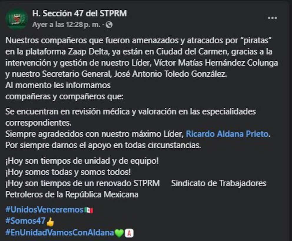 El sindicato compartió imágenes del operativo de rescate y traslado médico de los trabajadores afectados, quienes ya se encuentran en Ciudad del Carmen: “Nuestros compañeros que fueron amenazados y atracados por ‘piratas’ en la plataforma Zaap Delta, ya están en Ciudad del Carmen”, indicó el sindicato.