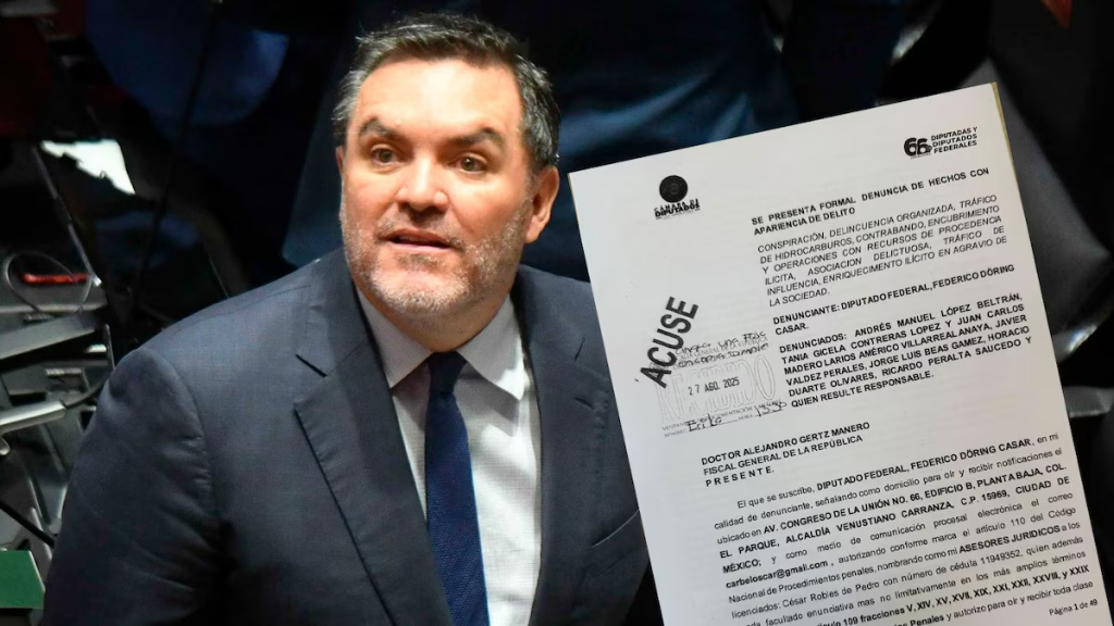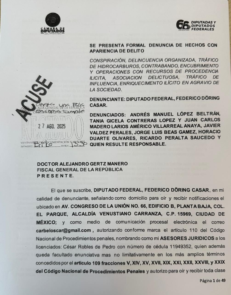 El diputado panista Federico Döring informó que denunció ante la Fiscalía General de la República (FGR) a diversos militantes morenistas, entre ellos a Andrés Manuel López Beltrán, Américo Villarreal Anaya, Horacio Duarte Olivares y Ricardo Peralta, entre otros.
