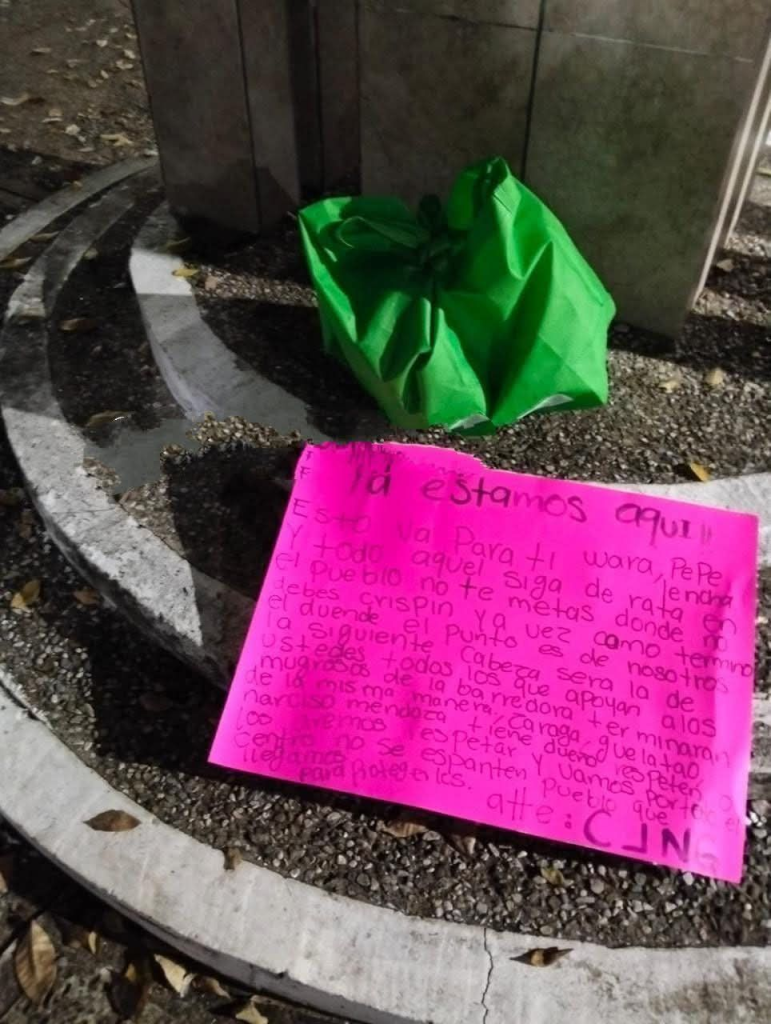 En las primeras horas de viernes fue hallada una cartulina con una bolsa extraña en el Parque El Jícaro, donde está el Monumento a Karmito, el Prolongación de Zaragoza, Colonia Nueva Villahermosa; el narco mensaje está firmado por el CJNG, donde asegura que “la próxima cabeza será de quienes apoyan a La Barredora”.