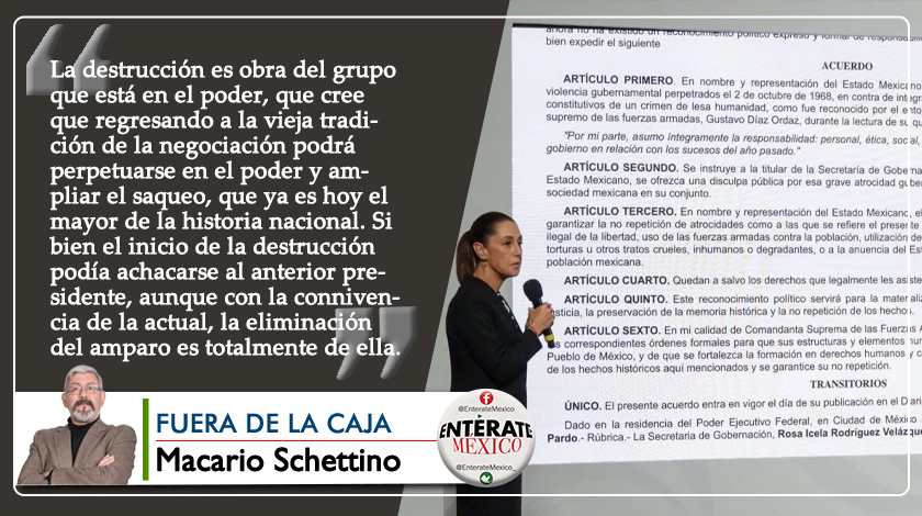 La destrucción es obra del grupo que está en el poder, que cree que regresando a la vieja tradición de la negociación podrá perpetuarse en el poder y ampliar el saqueo, que ya es hoy el mayor de la historia nacional. Si bien el inicio de la destrucción podía achacarse al anterior presidente, aunque con la connivencia de la actual, la eliminación del amparo es totalmente de ella.