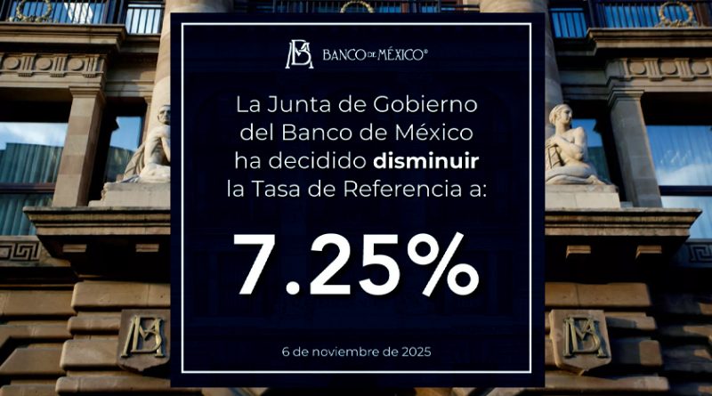 La Junta de Gobierno del Banco de México decidió reducir en 25 puntos base la Tasa de Interés Interbancaria a un día, para ubicarla en 7.25% a partir del 7 de noviembre de 2025, continuando con el ciclo de relajamiento monetario iniciado este año.