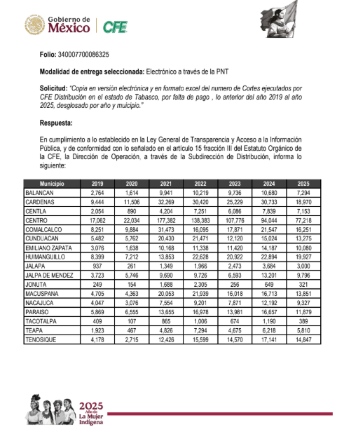 Los datos de la empresa eléctrica de México muestran que a la primera quincena del mes de noviembre del año 2025 se quedaron sin energía eléctrica un total de 239 mil 388 usuarios del estado de Tabasco que por alguna razón dejaron de pagar su recibo de consumo. Los cortes se han realizado en todos los municipios de la entidad.