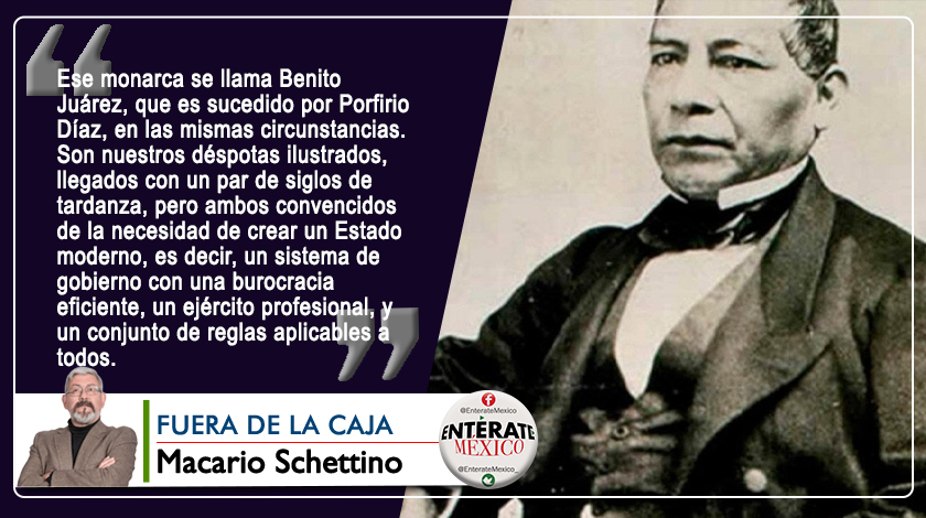 La desintegración de la Corona de España es un proceso que inicia con la invasión napoleónica, que no sólo produce las “independencias” americanas, sino la dispersión de los virreinatos. En México, esa desintegración interna impide la construcción de un gobierno estable por medio siglo. Cuando finalmente se logra, es porque regresamos a las viejas estructuras, con un monarca sostenido en acuerdos personales con hombres fuertes en las regiones del país. Ese monarca se llama Benito Juárez, que es sucedido por Porfirio Díaz, en las mismas circunstancias. Son nuestros déspotas ilustrados, llegados con un par de siglos de tardanza, pero ambos convencidos de la necesidad de crear un Estado moderno, es decir, un sistema de gobierno con una burocracia eficiente, un ejército profesional, y un conjunto de reglas aplicables a todos.