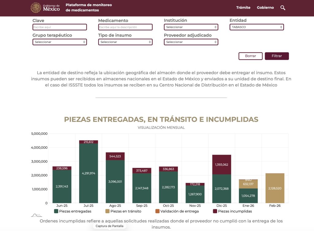 Medicinas “fantasma” en Tabasco: la plataforma oficial reduce 985 mil piezas de un plumazo