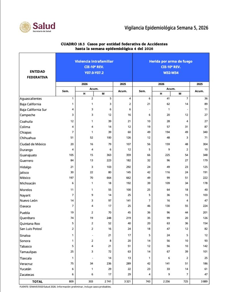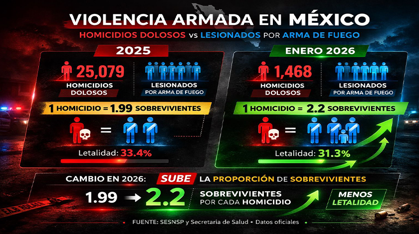 Para enero de 2026, el Secretariado Ejecutivo reportó apenas 30 homicidios dolosos en Tabasco, mientras que el sistema de Vigilancia Epidemiológica de la Secretaría de Salud contabilizó 66 personas heridas por arma de fuego (acumulado hasta la semana epidemiológica 4). Esto eleva la relación a 2.2 sobrevivientes por cada homicidio.