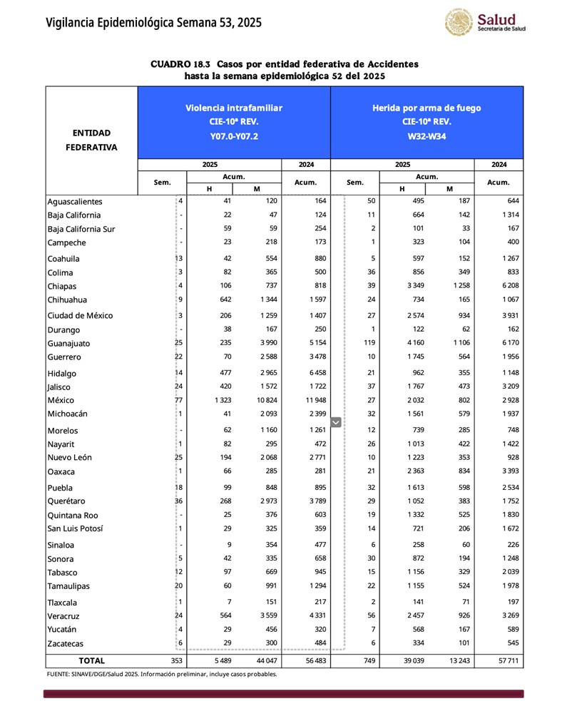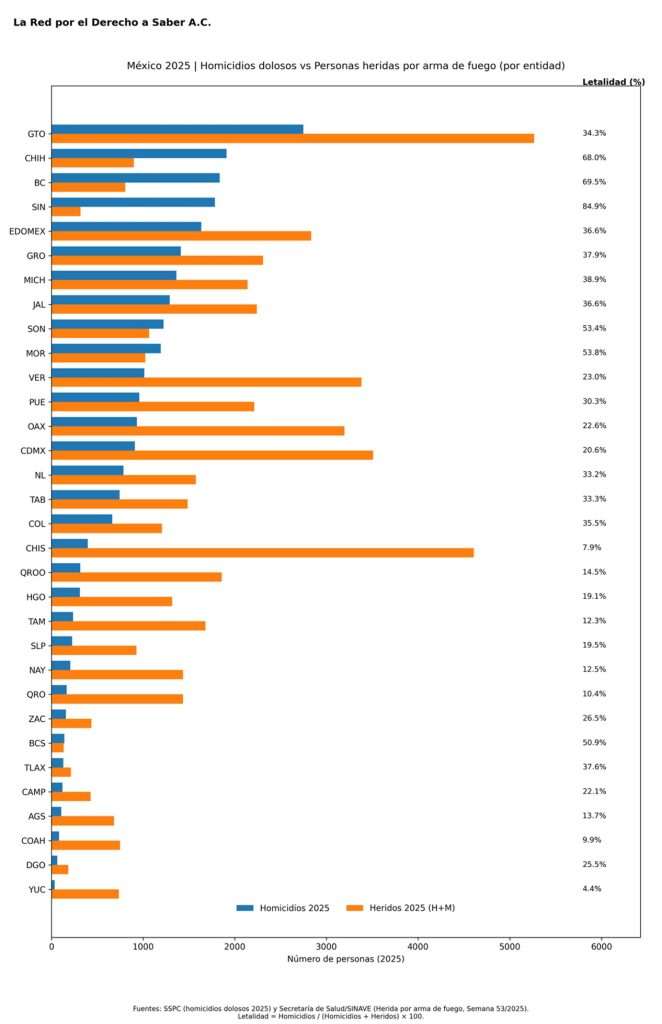 En el reporte ejecutivo del estudio coordinado por el politólogo Luis Trinidad Baños, se destaca que el panorama anual confirma que estamos ante un patrón estructural: Durante 2025, por cada homicidio doloso registrado en el país hubo un promedio de 2.08 personas heridas por arma de fuego.